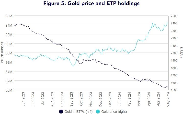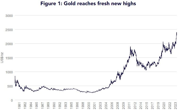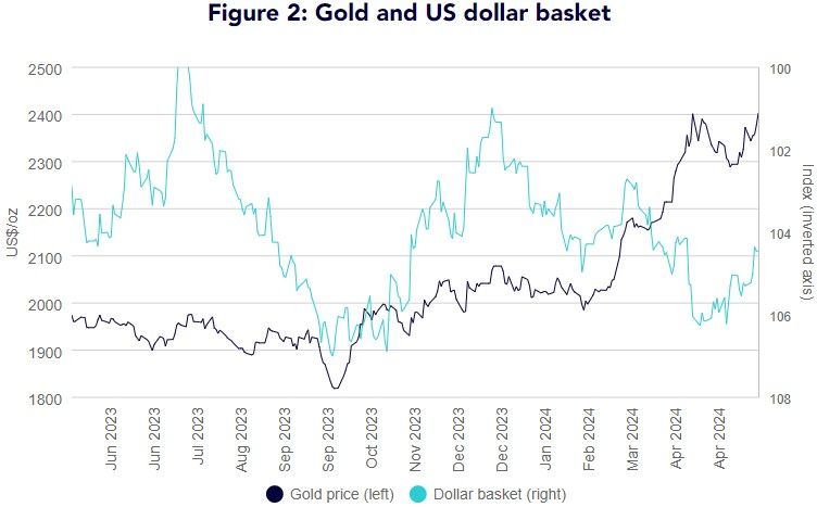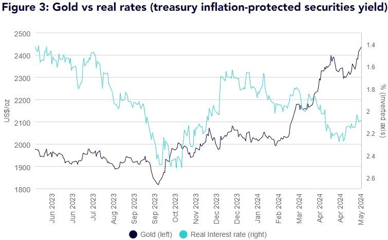 “Gold hit a fresh high once again on 17 May 2024 at US$2402.60/oz1,” Shah said. “Since its previous high on 12 April 2024 (at US$2401.5/oz), gold eased for most of the month on expectations of ‘higher for longer’ interest rate expectations in the US. The March US consumer price index [CPI] inflation, which was printed in April, was a catalyst for gold strength despite the elevated bond yields and strong dollar headwinds.”