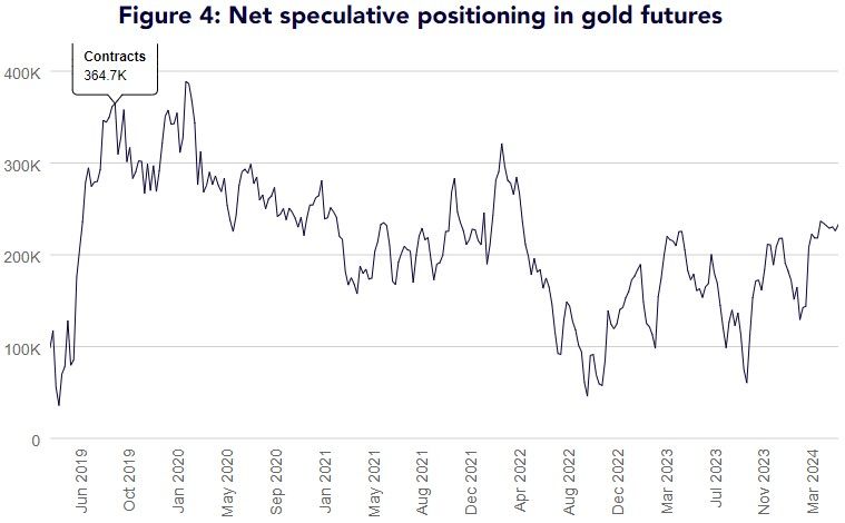 “Sentiment towards gold remains strong, with net speculative positioning hovering at the 230k handle since mid-April 2024,” Shah said.