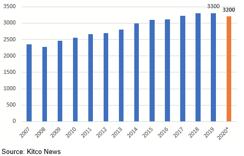 Annual gold mine production actually dropped about 3% last year, from 3,300 tonnes to 3,200 tonnes, as miners were forced to temporarily shut down their facilities.