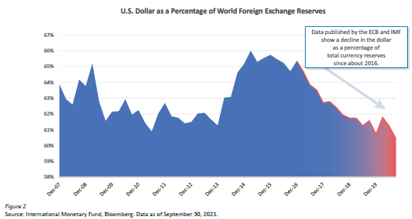 “…a series of equal and opposite reactions are occurring as nations move to remove the role of the U.S. dollar at the center of global trade and finance. This will have long-lasting structural impact in ending the dominance of the dollar as the world’s reserve currency.”