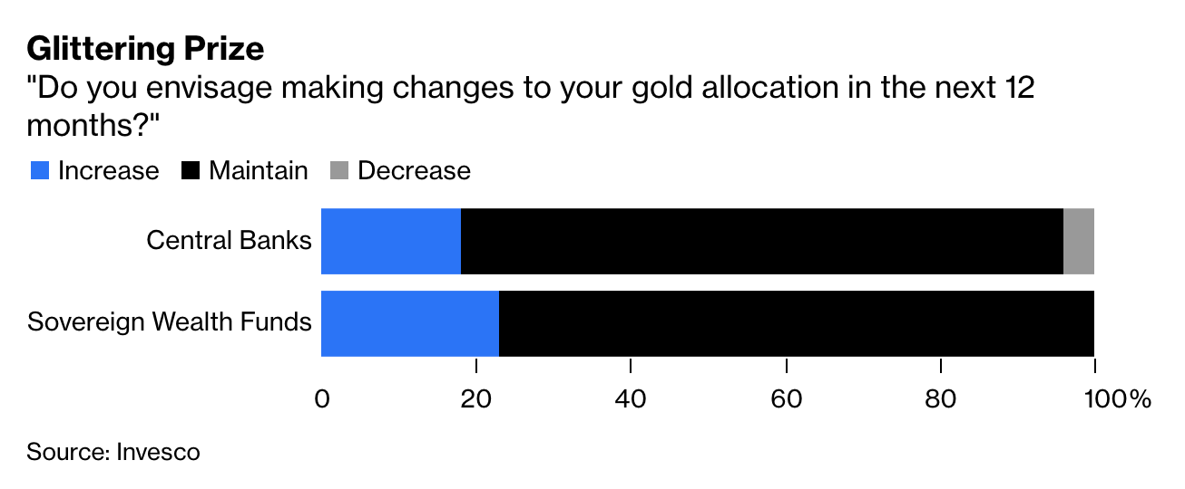 That interest has further to run. Some 18% of central banks plan to increase their gold holdings in the coming year, according to the Invesco report, while 23% of sovereign funds intend to boost their exposure.