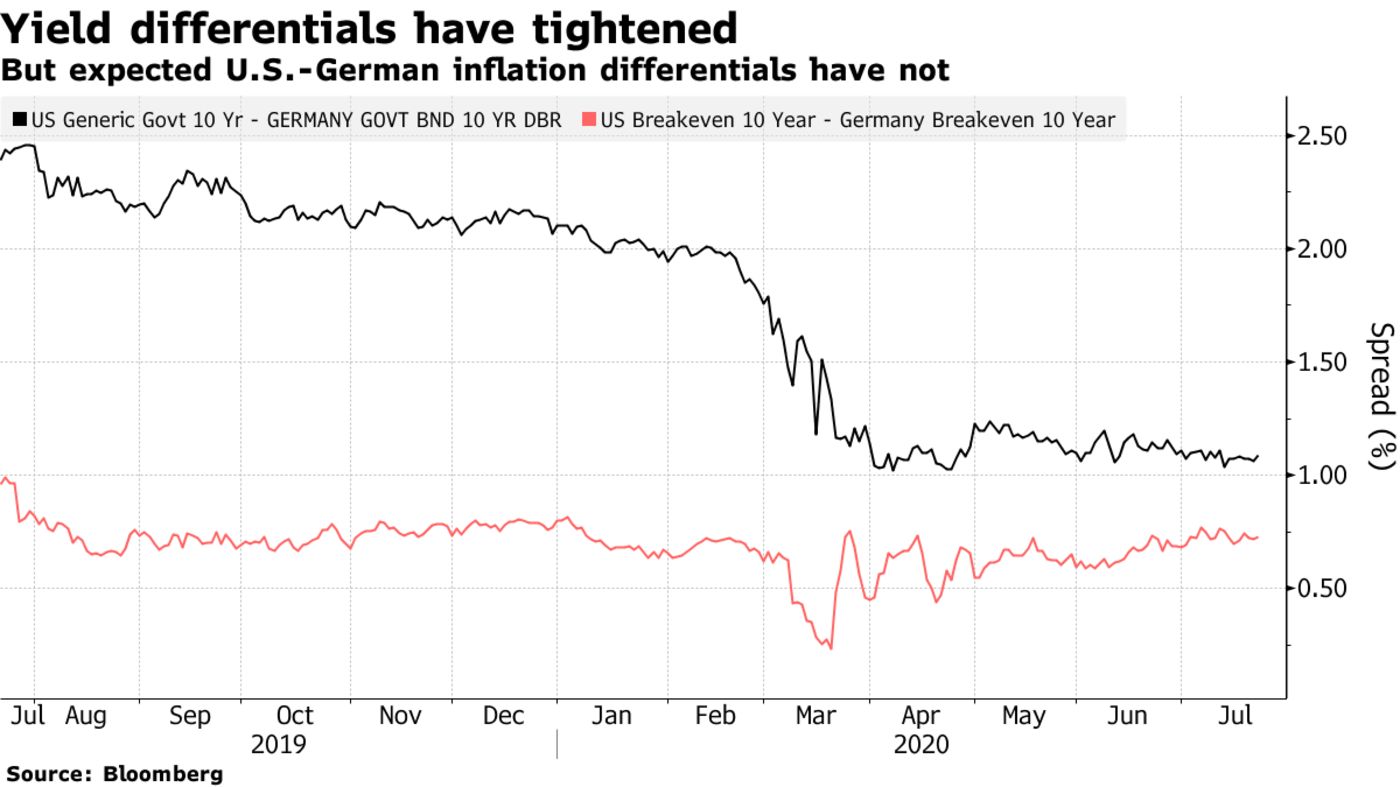 That brings us to the question of which assets could benefit. One natural consequence of all these developments should be a weakening of the dollar — particularly as other developed economies have fared much better to date in dealing with the pandemic. Most importantly, this might just be the moment for the euro to start gaining once again. The gap between U.S. and German nominal yields has dropped sharply this year, while the gap in inflation expectations is unchanged — which should mean far more support for the euro: